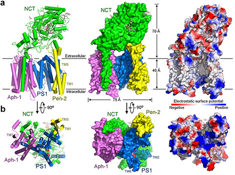 2014年6月,施一公研究组与英国MRC分子生物学实验室白晓晨博士和Sjors Scheres研究员合作在《自然》报道了分辨率为4.5埃的γ-分泌酶复合物电镜结构,观察到了其跨膜区域呈马蹄形排布的结构,但是受限于分辨率,无法准确区分各个亚基的具体排布(Lu et al, Nature);