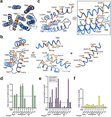 最新发表的Nature论文是施一公研究组与英国研究组合作的延续,在获得纯度好、性质均一的蛋白样品的基础上,通过收集更多的数据、大量的计算和升级的分类方法,计算构建出了3.4埃的原子分辨率的γ-分泌酶的三维结构,可以观察到绝大部分氨基酸的侧链以及胞外区部分糖基化修饰和结合的脂类分子。在高分辨结构的基础上,施一公研究组对PS1上的致病性突变体进行了研究,发现这些突变主要集中在两个较为集中的区域内,分别为跨膜区TM2-5以及TM6-9。他们对于其中一些突变体进行了生化性质的研究,发现这些突变会影响γ-分泌酶对于底物APP的酶切活性,然而对切割活性的影响却有所不同,因此对于已有的阿尔兹海默症的发病机理提出了一些新的探讨。