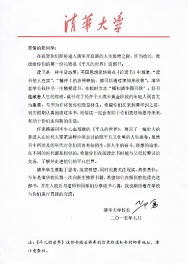 在祝贺你们即将进入清华开启新的人生旅程之际,作为校长,我送给你们的第一份礼物是《平凡的世界》这本书。