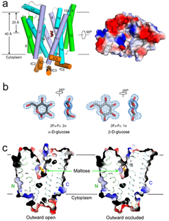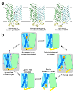 为了进一步得到GLUT3蛋白向胞外开放的构象,他们推测加入竞争性抑制分子麦芽糖或者纤维二糖之后,可能将GLUT3稳定于面向胞外的构象,这一猜测获得生化实验的支持。最终他们获得了GLUT3与麦芽糖结合的向胞外开放和向胞外闭合两种状态下的晶体结构。至此,通过进一步比较GLUT1向胞内开放的结构,GLUT家族蛋白通过交替开放(alternating access)转运底物的整个过程已经基本呈现在眼前。这不但是对于GLUTs家族转运机制研究的突破性进展,也为转运蛋白领域和膜蛋白结构生物学领域的研究起到了导向作用。同时,高分辨率GLUT3与底物结合的结构也为今后的小分子抑制剂的设计提供了重要的理论基础。