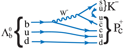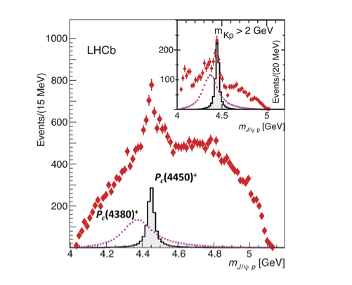 在底重子到粲夸克偶素、质子和K介子的衰变过程中,研究人员发现粲夸克偶素与质子组合的不变质量谱中存在明显的增强结构。进一步的分析表明,需要两个共振态才能很好地描述这个增强结构的效应,分别命名为Pc(4450)和Pc(4380)。由于这两个共振态通过强作用衰变到粲夸克偶素和质子,所以它们至少由五个夸克组成。