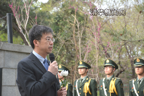 在纪念仪式中,校党委副书记史宗恺老师作了讲话。他说,对清华人来说,勇于担当首先是一种人生境界,一种家国天下的情怀;此外,勇于担当还要有为理想奋斗的勇气,更要有真才实学。这些年来,有许多纪念碑上没有出现名字、却为国家建设献出生命的清华人,比如2014年因公殉职的廖枝飞同志,我们应该永远铭记他们,向他们致敬。相信清华的担当精神能从一代代清华人身上传承下去并且发扬光大。