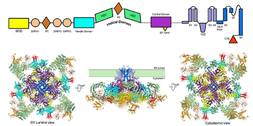 RyR以四聚体的形式行使功能,每个单体超过5000个氨基酸,因此其四聚体总分子量达到二百三十万道尔顿(2.3 MDa),是目前已知的最大离子通道蛋白。在哺乳动物中有三种RyR蛋白,其中RyR1主要分布在骨骼肌细胞中,RyR2主要分布在心肌细胞中,RyR3则最早在脑细胞中发现,它们在序列上具有高度保守性。RyR的离子通道开关受到包括钙离子浓度在内多种信号的复杂调控。RyR的突变体会导致诸如肌中央轴空病(central core disease, CCD)、恶性高热易感症(malignant hyperthermia susceptibility, MHS)等疾病。大量文献报道统计表明,目前已有超过500种RyR突变体与疾病有关。