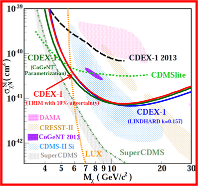 随后,CDEX合作组在2013年研究的基础上,采用了超低本底碘化钠反符合系统,并创新发展了新的本底甄别方法,开展暗物质实验运行,利用这些实验数据得到了新的物理结果,其研究成果于2014年4月在国际学术论文预印本文献库(arXiv.org)发布,该研究论文则于11月11日在《物理评论D》“快报”栏目(Physical Review D “Rapid Communication”)发表。这项研究成果在CDEX合作组2013年实验结果的基础上,把暗物质探测灵敏度提升了大约10倍,在与美国CoGeNT实验组相同的探测原理下,完全排除了该实验组过去多年来一直宣称的在轻质量暗物质区域发现暗物质存在的实验结果,是具有国际先进水平的暗物质探测灵敏度测量结果,对当前暗物质理论发展具有重要意义。