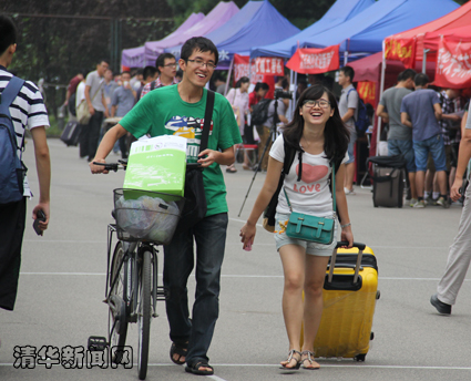 早上7点,在网球场内两侧依次排开的各院系迎新点便开始忙碌起来。由各院系负责研究生工作的老师和由高年级研究生担任的迎新志愿者,用热情细致的服务为每位走入清华园的研究生新生送上第一份清华印象。