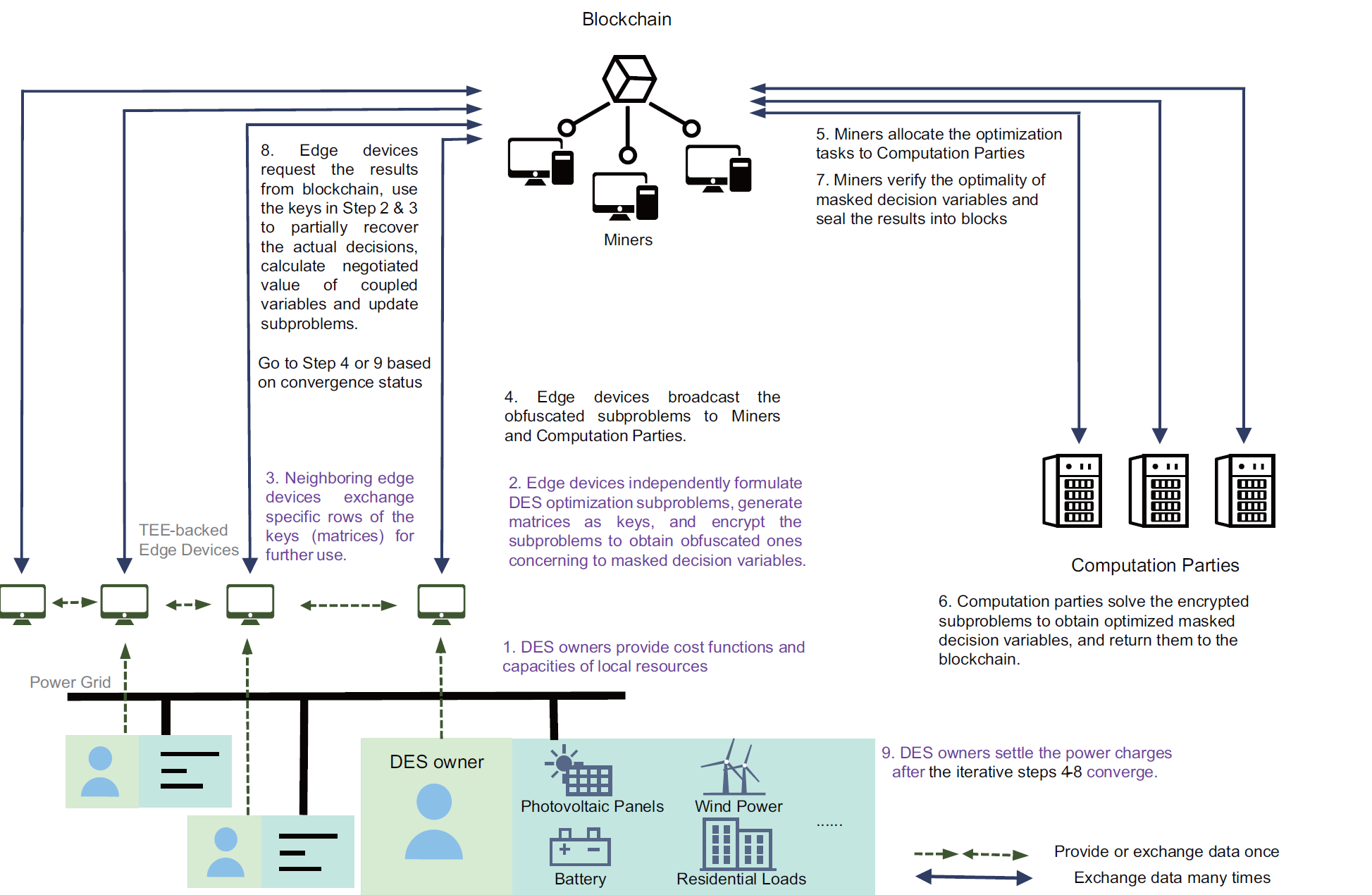 清华新闻网5月29日电 分布式能源系统利用分布式光伏、多能联供和储能等设备提供轻便灵活的能源服务,是实现“双碳”目标的重要手段。然而,由于分布式能源系统涉及海量终端用户,具有多主体特征,集中化的统一调控模式常常因为操作权限问题或潜在的恶意操纵行为不被分布式用户接受;现有的去中心化管理方案也因未能兼顾隐私保护和决策安全等需求,在应用上受到限制。