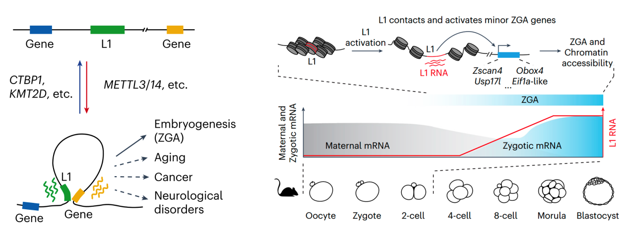 清华新闻网6月11日电 上世纪五十年代,芭芭拉·麦克林托克斯(Barbara McClintocks)首次在玉米中发现一类能在基因组中移动、改变自身位置的DNA序列——转座子,并在1983年获得诺贝尔生理学或医学奖。人类基因组中有接近一半的序列由转座子构成,其中,LINE-1(Long interspersed nuclear element-1, L1)占据了人类约17%的基因组序列,是目前人体内唯一活跃且具有自主逆转录转座能力的转座子。尽管L1在体细胞中的表达通常受到抑制,但L1在人和小鼠早期胚胎发育的合子基因组激活(zygotic genome activation,ZGA)过程中却瞬时高表达。这不仅说明L1的表达受到极其严格和精确的调控,而且暗示L1的表达在关键生理过程具有重要作用。然而科学界对于L1表达是如何被调控的以及L1在基因调控和ZGA中的功能还知之甚少。