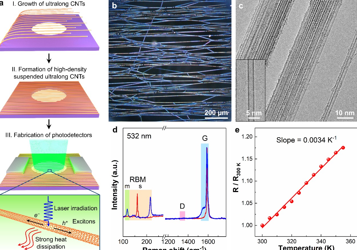 相关成果以“基于悬空超长碳纳米管的高性能光电探测器”(High-Performance Photodetectors Based on Suspended Ultralong Carbon Nanotubes)为题,于8月26日发表于《美国化学会·纳米》(ACS Nano)。