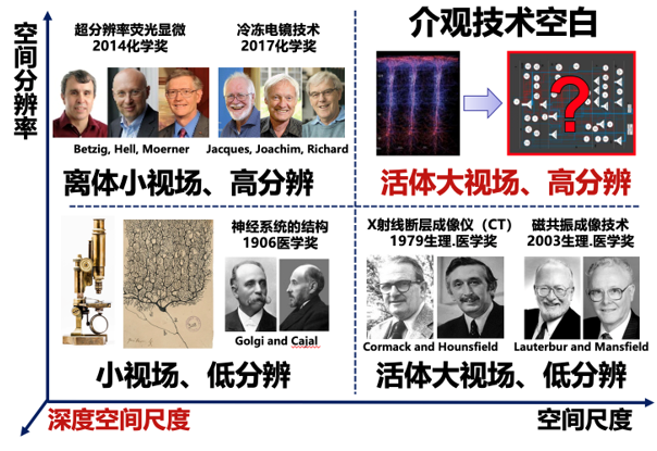 清华新闻网9月14日电 细胞是生命活动的基本单位。每时每刻,人体内都在上演着大量不同类型细胞间交互作用所形成的交响曲。然而,在这一连接微观与宏观之间的介观尺度上,却存在巨大的技术空白,使得当前研究难以在哺乳动物的活体环境器官尺度下同时观测大量细胞在不同生理与病理状态下的时空异质性,极大限制了脑科学、免疫学、肿瘤学、药学等学科发展。仅以脑科学为例,大量神经元间的相互连接和作用涌现出如智能、意识等功能,厘清神经环路的结构和活动规律是解析大脑工作原理的必由之路。然而具备单神经元识别能力的传统显微镜往往只具备毫米级视场,仅能覆盖小鼠单个或几个脑区实现单个平面的神经信号动态记录;功能核磁虽然能够实现三维全脑范围观测,但空间分辨率却远不足以识别单细胞。因此,2013年启动的美国脑计划也将“大规模神经网络记录技术”列为九大资助领域之一。同样,对于肿瘤学而言,只有兼具大视场与高分辨才能全景式捕捉肿瘤发生发展的完整过程,从而更精准地研究不同药物反应,发现新的药物靶点。