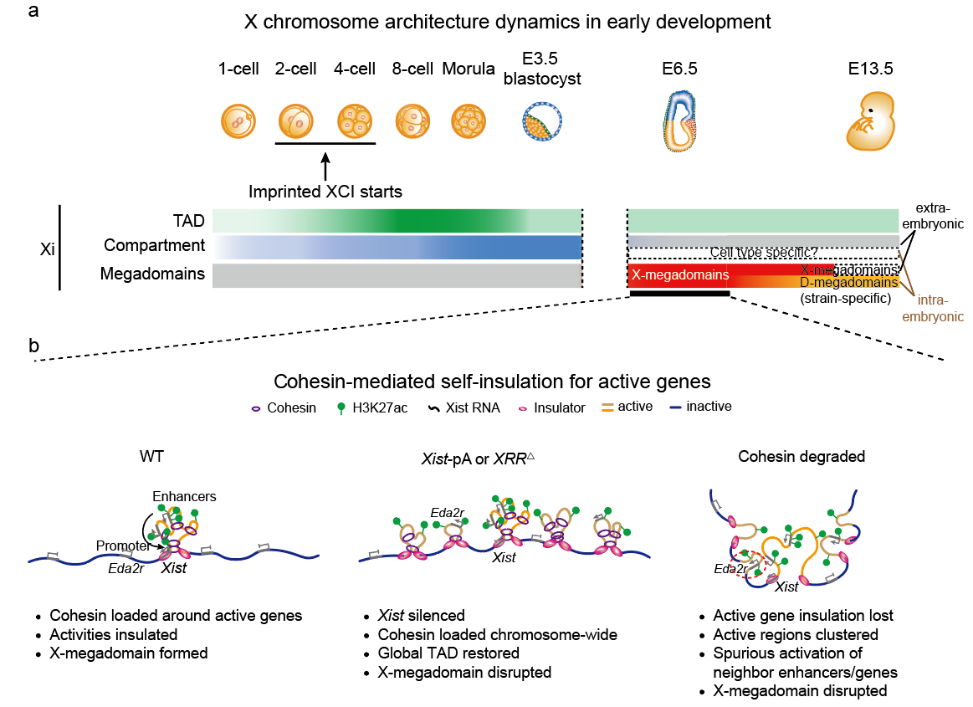 清华新闻网9月20日电 在哺乳动物中,雌性(XX)与雄性(XY)细胞具有性染色体二态性。为了平衡基因表达水平,在胚胎发育早期,雌性细胞内一条X染色体会发生转录失活(X chromosome inactivation, XCI)。X染色体失活异常,会引起严重的胚胎发育缺陷,多种人类智力缺陷疾病,甚至胚胎死亡。因此研究X染色体失活及其调控机制具有重要的科学意义和临床价值。X染色体失活伴随着剧烈的X染色质结构变化,最终呈现为凝缩的异染色质状态,被称为“巴氏小体”。之前对体外小鼠胚胎干细胞(mESC)分化过程的研究发现,失活X染色体的拓扑结构域(TAD)和区室(compartment)结构都明显减弱,同时出现了以宏卫星序列Dxz4为边界的超级结构域(Dxz4-separated megadomains,D-megadomains)。