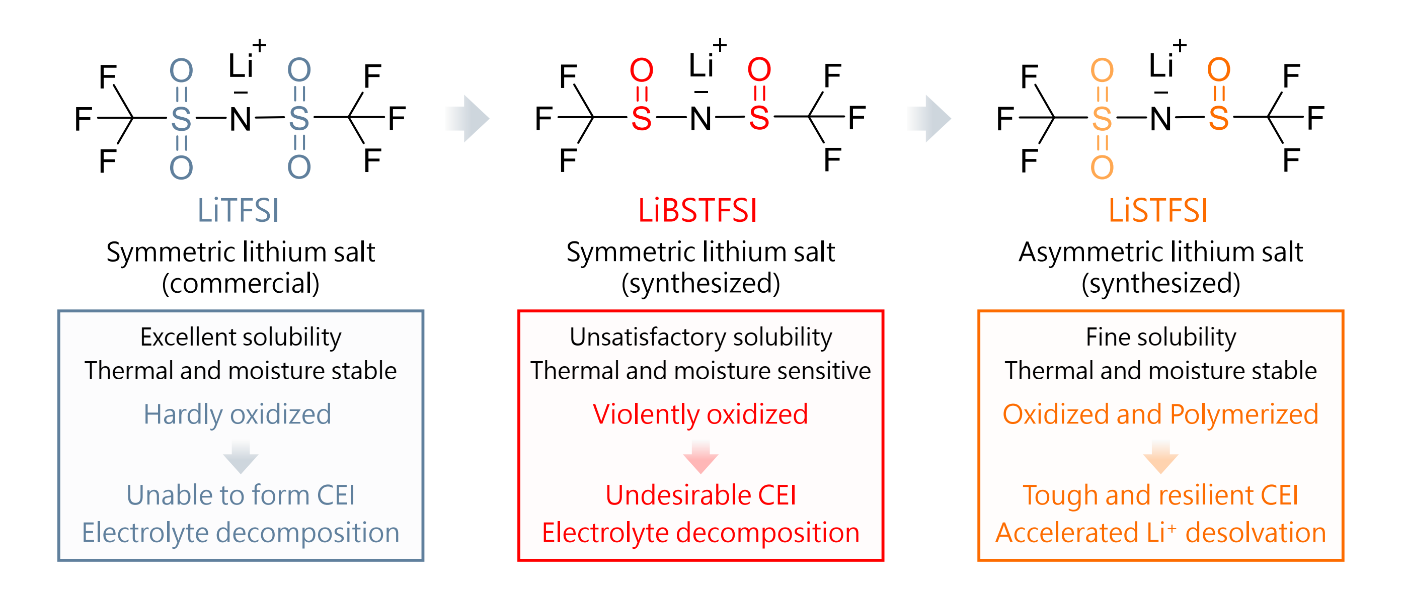 图1.商业化磺酰亚胺锂盐LiTFSI与亚磺酰亚胺锂盐LiSTFSI和LiBSTFS的设计思路及理化特性