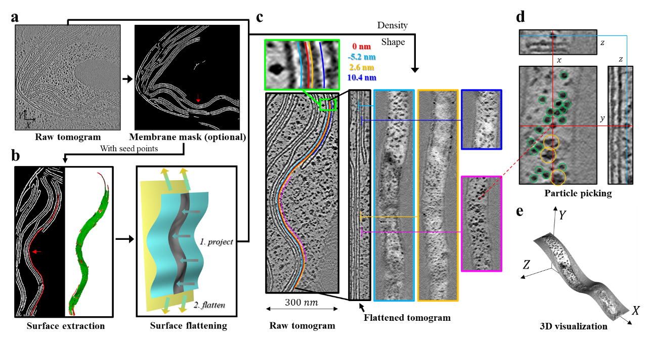 清华新闻网1月13日电 冷冻电子断层成像(cryo-electron tomography,cryoET)技术、冷冻聚焦离子束(cryo-focused ion beam,cryoFIB)样品减薄技术和子断层平均技术(sub-tomogram averaging,STA)的进步推动了生物大分子在细胞中的原位结构测定,对于研究膜蛋白结构及其在细胞环境中的相互作用具有重要意义。断层扫描图像(tomogram)是三维图像,但由于低信噪比和细胞内拥挤的环境,当前的观察方法仍主要依赖查看tomogram中的二维截面。然而,细胞中的膜结构通常呈弯曲形态,这使得通过二维截面难以直接观察膜表面蛋白的分布。同时,膜信号强烈的衬度也会干扰膜蛋白的识别,增加原位观察和结构解析的难度。