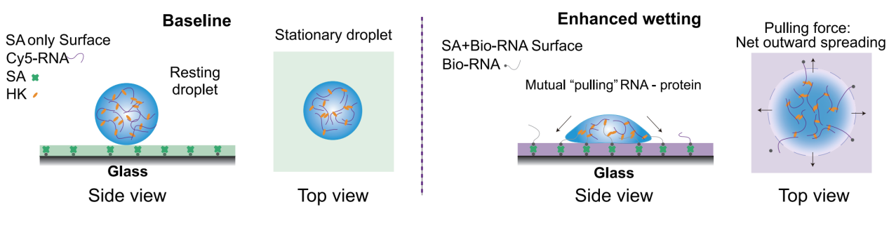 研究结果表明,HNRNPK凝聚体与游离的Xist之间能够产生相互的牵引力并产生润湿现象,在RNA的作用下,软化HNRNPK-Xist共相分离液滴,表现为铺展和扁平化增强的趋势(图2)。这些结果揭示了HNRNPK液滴与Xist RNA之间的相互作用促进了RNA以相分离通道的形式进行扩散,并通过增强液滴的形变和润湿行为维持Xist在X染色体扩散的高效性和稳定性。