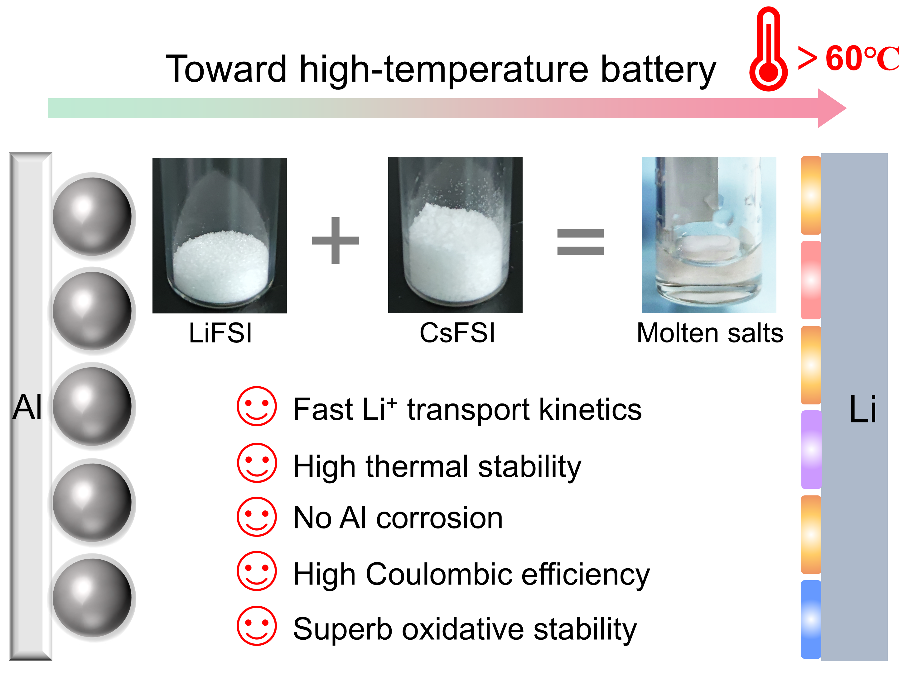 相关研究成果以“锂金属电池的具有高固有热稳定性和电化学稳定性的无溶剂熔融盐电解质”(Molten salt electrolytes with enhanced Li+-transport kinetics for fast-cycling of high-temperature lithium metal batteries)为题,于1月7日发表于《能源与环境科学》(Energy & Environmental Science)。