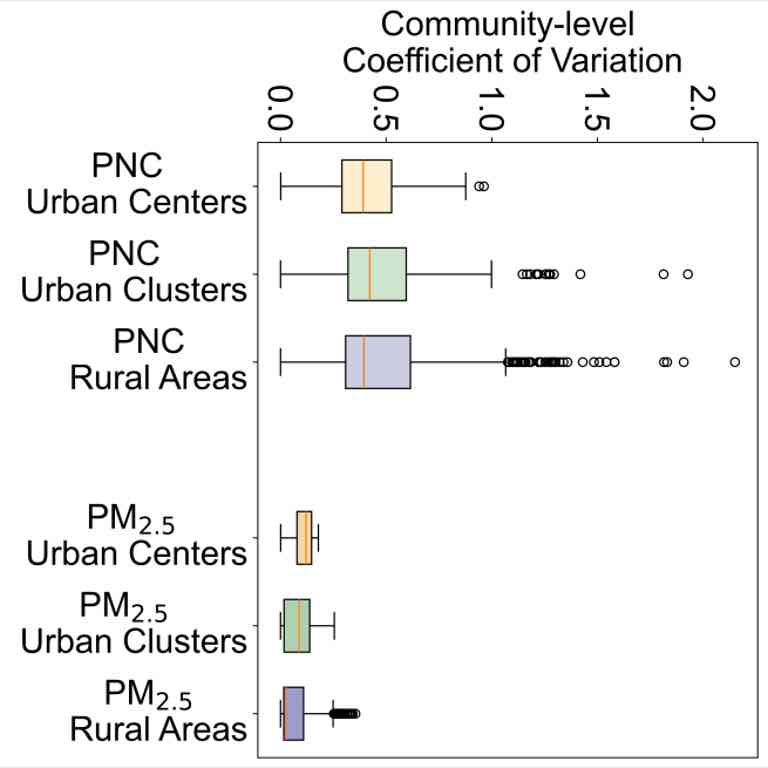 UFPs的空间变异显著高于PM2.5。研究量化了UFPs的空间异质性,发现其在城市中心的UFPs变异系数为PM2.5的4.7±4.2倍,而在农村地区UFPs变异系数高达PM2.5的13.8±15.1倍。这一结果表明,相较于PM2.5,UFPs的时空分布更加不均匀,单一固定监测站难以准确反映实际暴露水平,更需高精度的时空建模方法进行补充。