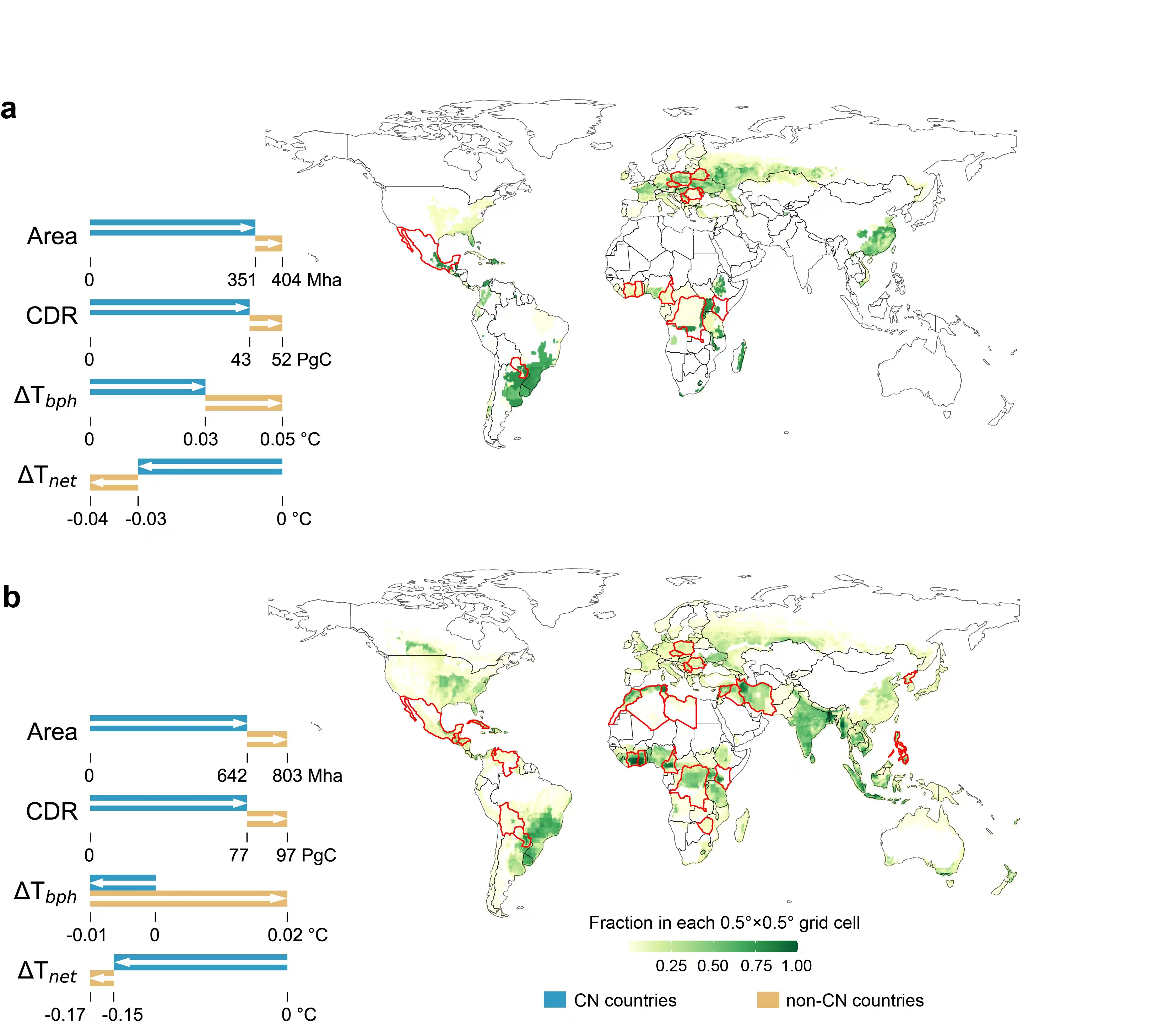 结果显示,仅在碳中和国家种植柳枝稷(代表性生物能源作物),至2100年可为全球贡献43至78PgC净碳去除量。在此基础上,若非碳中和国家选择进一步种植,还可额外贡献9至20PgC;这些净碳去除量将通过生物地球化学效应产生0.01至0.02°C的降温效果,其贡献比例超过了这些国家种植面积的比例(14%至20%)。尽管这种生物地球化学降温效应会被生物物理升温效应部分抵消,但非碳中和国家的种植仍为全球陆地贡献了额外的降温效益。研究表明,非碳中和国家的气候缓解潜力将为全球气候目标的实现提供重要支持。在未来BECCS技术的推广与实施过程中,各国应加强合作,依据地区特点优化生物能源作物种植策略,并协调应对生物物理增温效应,以推动全球气候目标的实现。