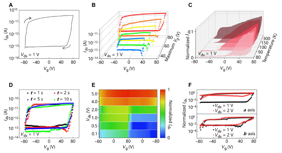 研究进一步揭示了ACPS材料的栅控电学传输行为表现出明显的电滞回特性。通过一系列测试,研究推断这种电滞回现象的主要机制是材料中本征离子对电子的捕获作用。同时,研究团队发现ACPS中Ag离子的面内各向异性迁移行为能够有效调控这种电滞回现象。这一成果为二维材料平面内电学各向异性的调控提供了新的调控自由度。