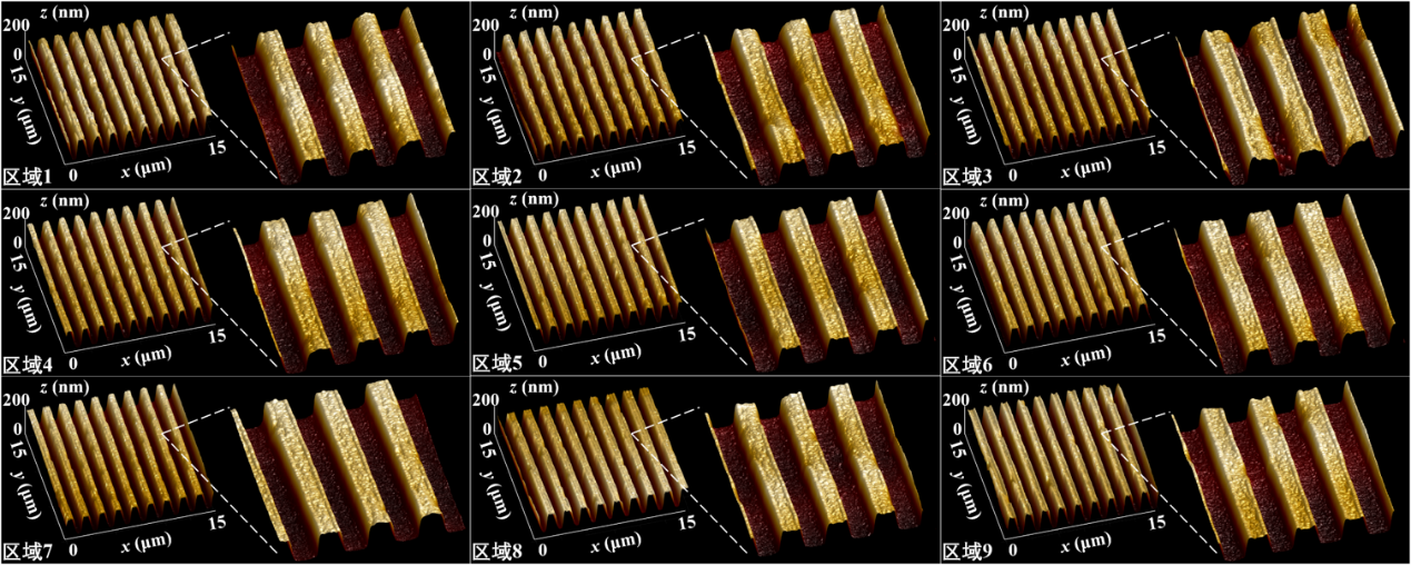 进一步地,使用原子力显微镜(AFM)对样品1中3×3区域的每个曝光区域随机选择一个点进行AFM测量,其槽型如图4所示。首先以较低分辨率进行较大面积的扫描,再以高分辨率进行小面积的扫描。图5为AFM测量结果的截面图,各区域槽型具有较好的一致性。