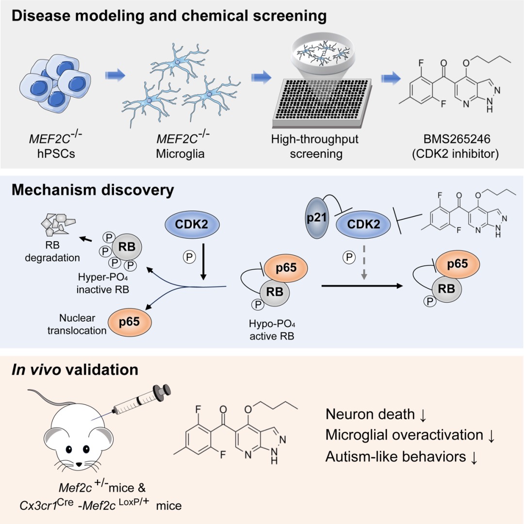研究团队通过基因编辑技术,在实验室培养的人源小胶质细胞中敲除MEF2C基因。失去这个“车速控制系统核心元件”的细胞随之陷入混乱:负责抑制过度反应的p21蛋白产量锐减,而本该被约束的CDK2激酶却异常活跃,这就好比控速系统的关键制动环节失效。更糟糕的是,CDK2的过度活跃直接摧毁了RB蛋白——这个如同汽车“安全锁”的关键分子一旦缺失,就会在小胶质细胞被激活时彻底释放NF-κB信号通路,继而引发TNF-α、IL-6等炎症因子的大规模爆发,如同自动驾驶汽车在速控系统失灵时进行加速,一定会横冲直撞,造成严重破坏。