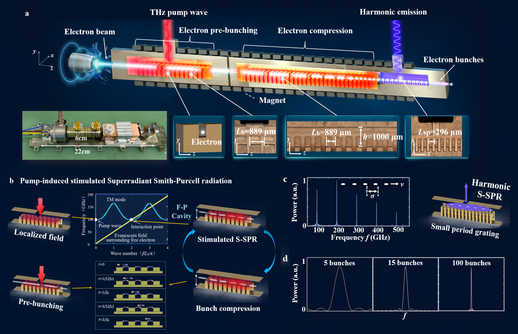 研究团队提出了泵浦诱导的受激S-SPR(PIS-SPR)新机制,并实现基于PIS-SPR的超窄频谱线宽小型化自由电子太赫兹辐射源。利用低功率、低频率泵浦波对直流电子束进行预群聚;预群聚电子与光栅和F-P腔共同作用产生PIS-SPR,泵浦波频率的电磁波功率被放大至百瓦以上,同时压缩电子形成高度群聚的周期电子团;最后利用小周期光栅提取电子团周围的高阶倍频分量,产生高频率、窄线宽相干太赫兹辐射。PIS-SPR效应克服了电子团数量有限、电子能量波动和库伦排斥恶化电子团等因素的影响,因而可以获得超窄频谱线宽的自由电子辐射。