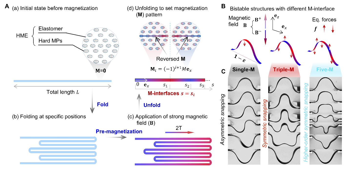 针对这一挑战,精品无码久久久久久久久_国产精品一区二区三区四区五区_欧美亚洲国产激情一区二区_午夜精品久久久久久久久久久久_亚洲欧洲中文日韩久久AV乱码_91精品欧美一区二区三区_久久精品一区二区免费播放_日韩高清大片永久免费入口_久久国产欧美日韩精品免费_欧美一区二区三区久久综合_国产精品天天狠天天看航天航空学院张迎超副研究员、力学与工程交叉研究院高华健院士和俞璟副教授联合其他研究者创新性地引入了“磁化界面”(M-interfaces)设计理念,在硬磁弹性体结构中预设交替磁化区域,使结构在外加磁场作用下形成一系列方向交错的等效力对(图1)。该构型在保持系统本征对称性的基础上,构建了内部“力场博弈机制”:驱动力诱导结构发生突跳失稳,等效阻力则有效抑制非对称模态的生成。借助这一“分布式调控”策略,研究团队首次在准静态条件下实现了对称性突跳失稳路径的稳定激发,并建立了适用于更复杂双稳系统的通用设计方法。