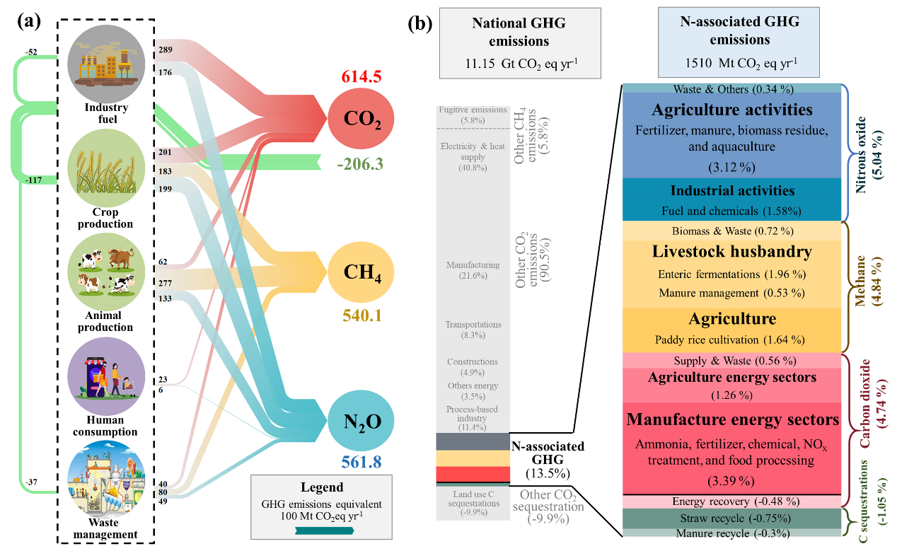课题组通过物质流分析法与生命周期清单方法构建了基于代谢视角的碳-氮耦合环境足迹模型,并整合国家尺度温室气体清单,系统分析了氮代谢对温室气体排放的贡献。研究表明,2015~2020年中国氮代谢不仅引起氧化亚氮(N2O)温室气体排放561.8 Mt CO2-eq yr-1(1 Mt CO2-eq代表百万吨二氧化碳当量),还包含了二氧化碳(CO2)排放614.5 Mt CO2-eq yr-1、甲烷(CH4)排放540.1 Mt CO2-eq yr-1和碳抵消效应206.3 Mt CO2-eq yr-1,占国家温室气体排放总量的13.5%。研究结果揭示了碳-氮耦合效应在代谢尺度上的关联被忽视,协同效应和权衡效应应当被重视。