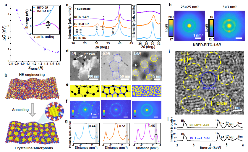 这种通过熵工程构建结晶/非晶相结构的策略是基于对不同熵值模型进行吉布斯自由能的热力学计算开展的,计算结果表明,随着体系熵值的增加,材料的非晶形成能垒明显降低,即提高体系熵值可有效抑制结晶,进而在材料内部构建稳定的非晶相。通过X射线衍射(XRD)、同步辐射X射线衍射、扫描透射电子显微镜(STEM)、四维扫描透射电子显微镜(4D-STEM)等对不同熵值薄膜进行微观结构表征,结果表明随着熵值增加,材料内部的晶粒尺寸逐步减小且非晶含量增加,最终获得的Bi1La0.75Nd0.75Pr0.75Sm0.75Ti3O12高熵薄膜具有结晶/非晶结构(纳米晶尺寸约2纳米),且结晶与非晶结构存在一定的成分波动。这主要是因为热处理过程中发生了类似spinodal的相分离,允许具有较高原子迁移率(构型熵较低)的成分开始结晶,而一段时间后,由于其缓慢的结晶性质,迫使剩余的高熵组分稳定在非晶阶段(图1)。