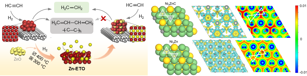 近年来,该团队针对炔烃加氢体系开展了深入研究,取得了系列重要进展。为了抑制C-C偶联副反应,提高乙烯选择性和催化剂稳定,团队提出了高纯相金属间化合物催化剂的合成策略,利用金属间化合物原子有序排布的特点,调控活性金属的电子性质和几何结构,实现了高纯相金属间化合物的可控制备并显著提升催化剂反应性能,相关成果相继发表在《化学科学》(Chemical Science)和《ACS催化》(ACS Catalysis)等杂志上。针对以生物质、煤或天然气为原料经乙炔制备乙烯的非石油路线,团队攻克了原料气中乙炔/一氧化碳浓度高等苛刻条件带来的挑战,结合团队在浆态床反应器理论研究和工程放大方面的基础,提出了乙炔制乙烯液相加氢新技术,相关成果相继发表在《化学工程杂志》(Chemical Engineering Journal)、《工业与工程化学研究》(IECR)和《碳未来》(Carbon Future)等杂志上。