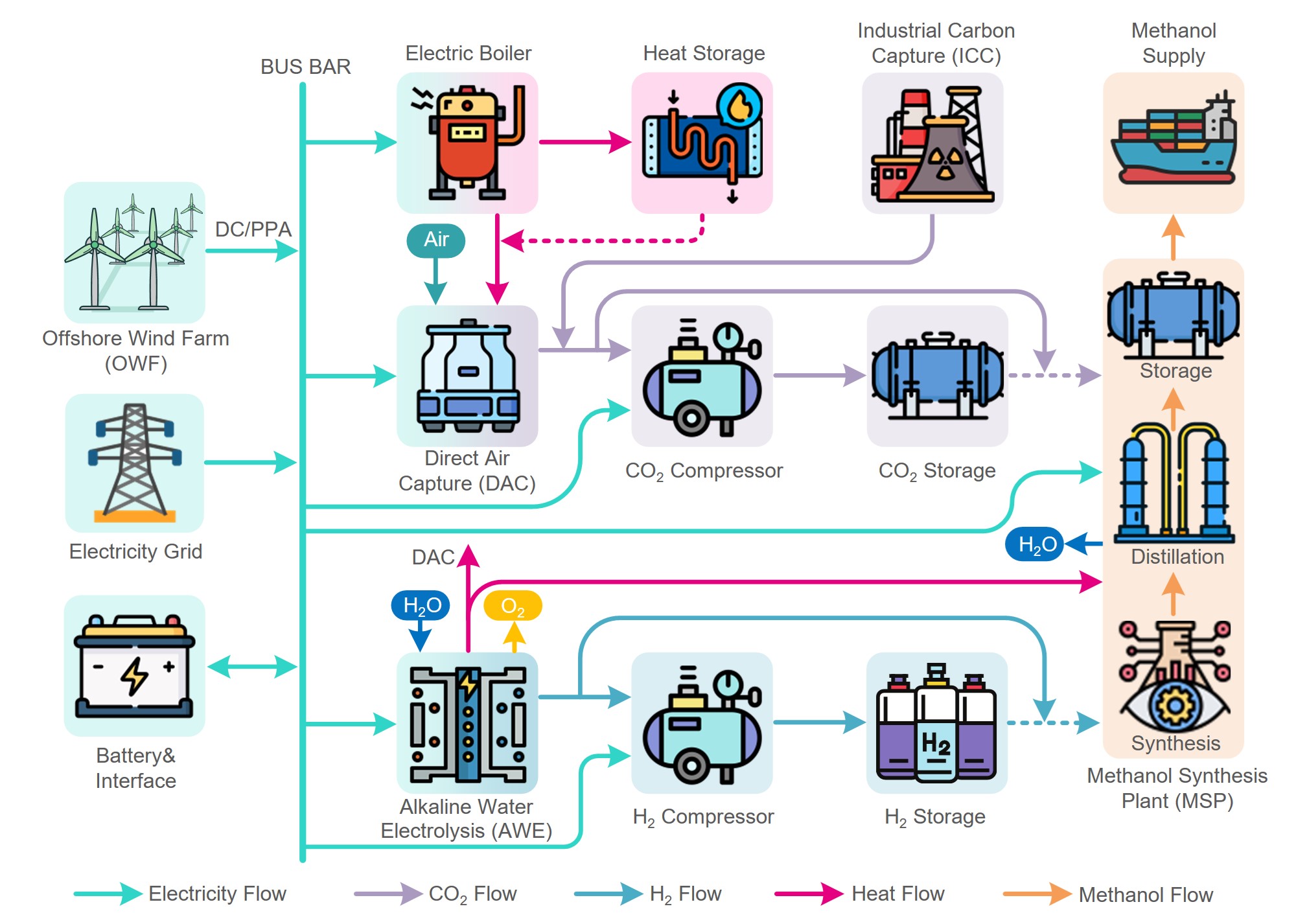 沈欣炜团队创新性地提出并优化设计了在欧盟港口“海上风电驱动绿色甲醇原位生产与加注”系统。该方案将海上风电场、电解水制氢装置(碱性电解槽)、碳捕集技术(工业碳捕集或直接空气捕集)以及甲醇合成装置集成,实现从风电到绿色甲醇的“一站式”生产与加注,有效避免了燃料运输带来的额外成本和排放,并满足了欧盟对可再生非生物来源燃料全生命周期温室气体减排至少70%的严格要求。