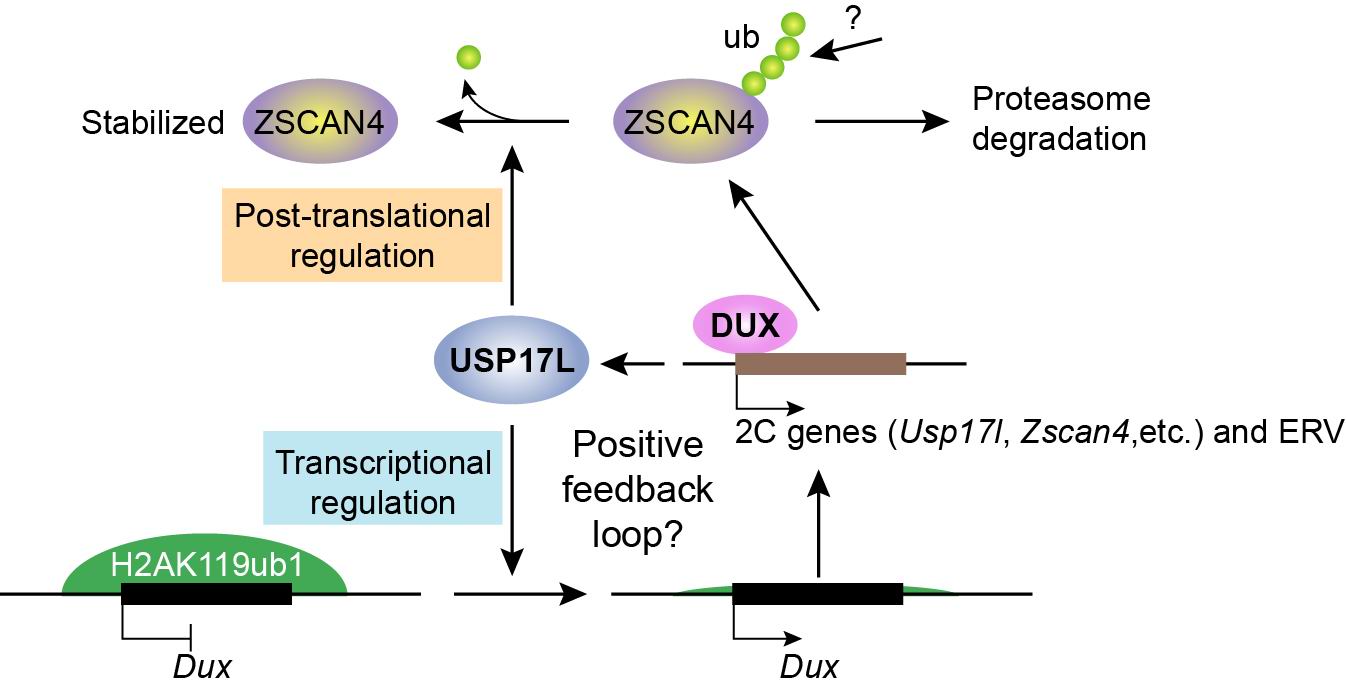 综上所述,该研究首次揭示了USP17L通过去泛素化H2AK119ub1激活Dux、2C基因和逆转录转座子的表达,通过去泛素化ZSCAN4以稳定ZSCAN4,从而在转录和翻译后水平促进和稳定2-细胞程序的新机制。该研究为合子基因组激活、2C程序调控及细胞全能性研究提供了重要启示和参考。