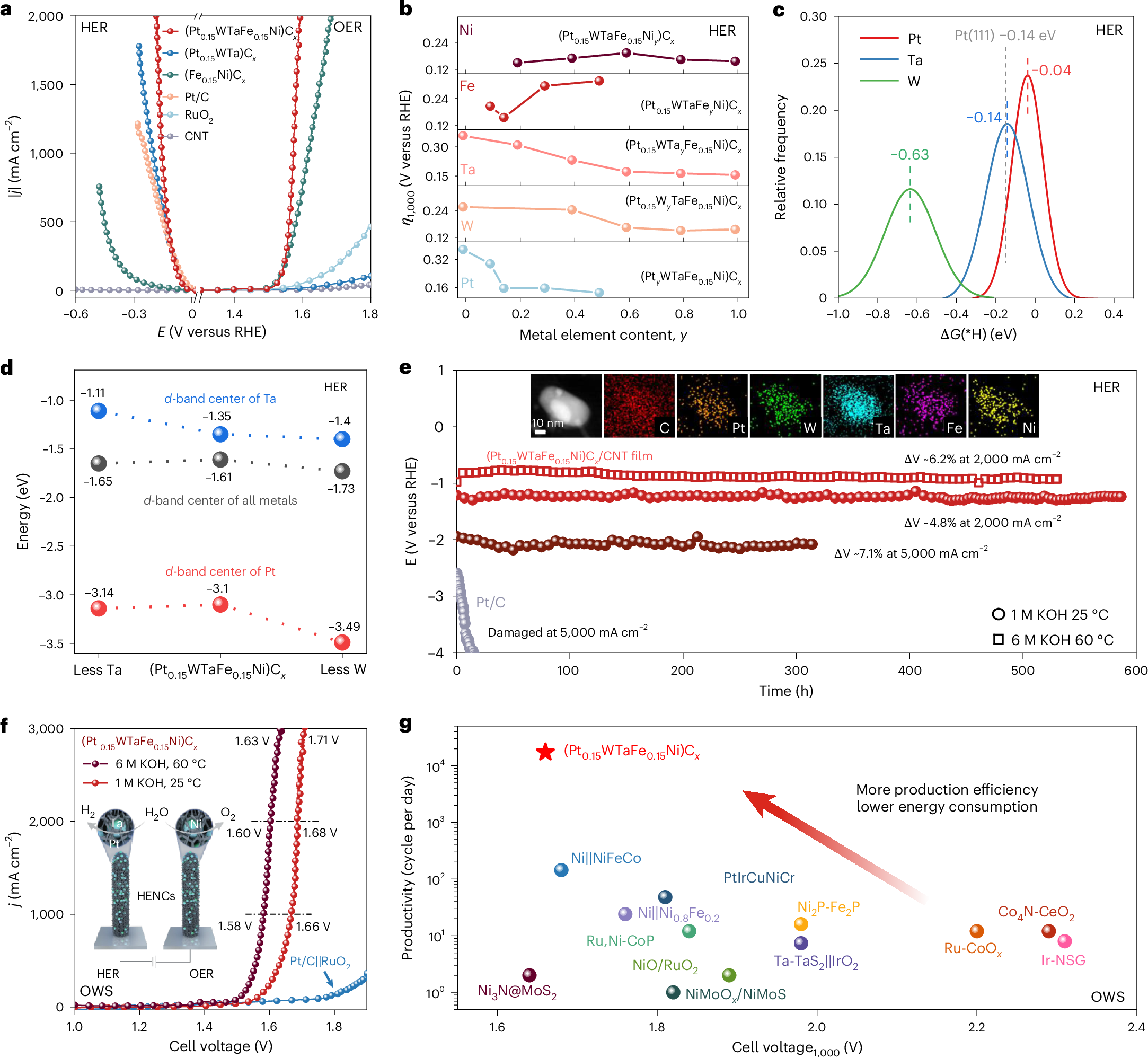 研究团队以5元HENCs((Pt0.15WTaFe0.15Ni)Cx)为模型体系开展电催化全解水研究。全解水测试中,(Pt0.15WTaFe0.15Ni)Cx仅需1.63V即可在工业条件下(6M KOH,60 ℃)实现3000mA cm-2的电流密度,且在2000mA cm-2下连续运行600h后HER过电位仅上升约4.8%,5000mA cm-2下320h后仅上升约7.1%,在超大电流密度下表现出优异的稳定性(图2)。
