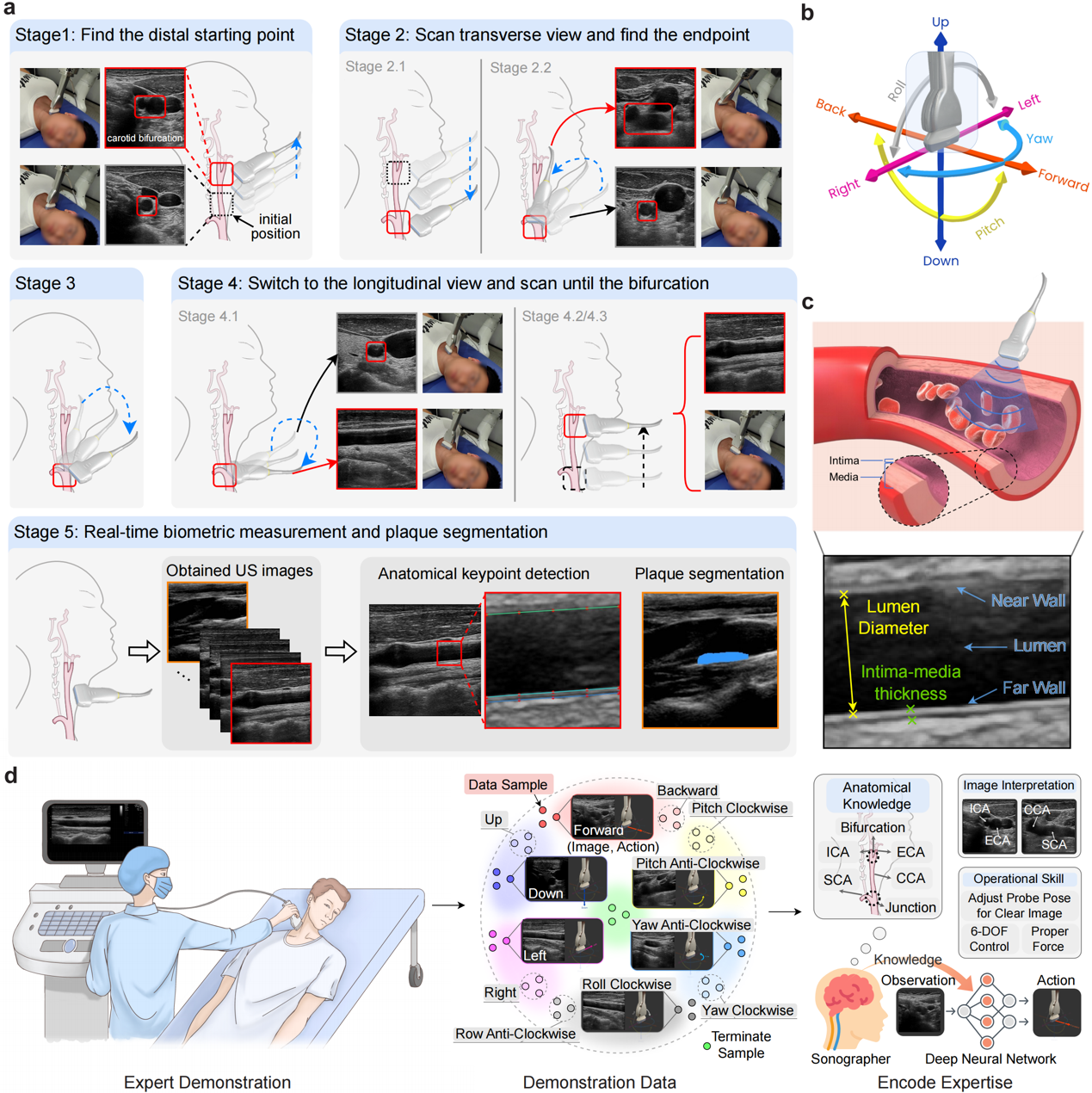 图2.全自主超声机器人工作流(a)标准化扫查流程(b)探头六自由度示意图(c)颈动脉结构参数示意图(d)专家示教数据集