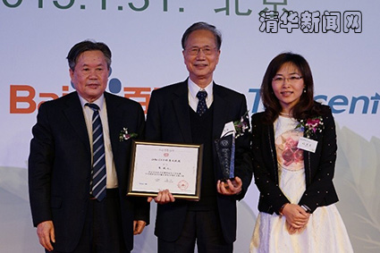 李国杰院士(左)与腾讯公司副总裁王巨红女士(右)为张钹院士(中)颁奖。