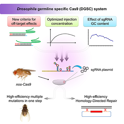 在利用模式动物进行基因功能研究的过程中,一套特异、高效的基因编辑工具显得尤为重要。2013年,清华医学院倪建泉研究组在PNAS《美国科学院院刊》发表研究论文,首次报道了一种高效、可遗传、低耗的果蝇基因组编辑技术,利用转基因果蝇生殖细胞特异性的Cas9和优化的sgRNA的DNA载体来实现基因编辑。为了提高CRISPR/Cas9系统的特异性,倪建泉研究组又在G3: Genes, Genomes, Genetics《G3:基因,基因组,遗传学》发表研究论文报道了特异性更高的CRISPR/Cas9D10A系统。在利用CRISPR/Cas9进行基因编辑的过程中,如何选择一个高效、特异的sgRNA对基因编辑的成败至关重要。倪建泉研究员带领其团队,开展了大量的工作,系统性的分析了sgRNA序列与基因编辑效率之间的关系。首次提出了高效sgRNA的筛选策略,并确定了脱靶效应的新标准。本研究中,利用优化的sgRNA可以实现一步编辑3个,甚至4个基因,同时极大的提高了同源重组的效率。