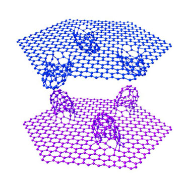 图为柱撑石墨烯结构示意图,该图表示:当两层石墨烯接近时,石墨烯片上的突出结构起到柱撑功能,从而防止此类石墨烯自发堆叠。