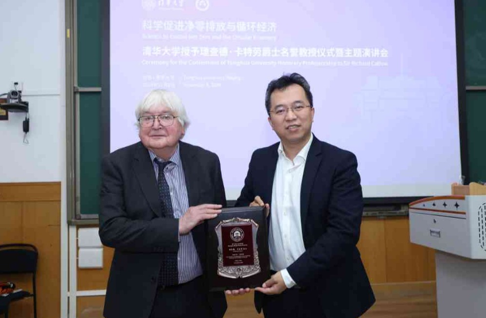 讲座结束后,化工系教授张强向理查德·卡特劳爵士赠送了清华海外名师讲堂纪念牌。