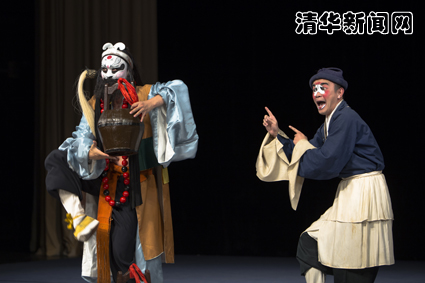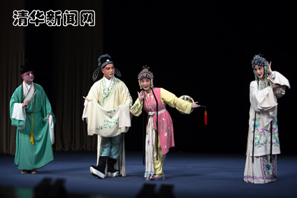 演出一共进行了两个半小时,虽然其布景简单,多为一桌数椅,但演员的神态、动作无一不让观众身临其境,深深融入到剧目氛围中。如《白罗衫•诘父》里,为官的儿子和曾为江洋大盗的养父几个问答之间,用其微微颤抖的身体和唱段之间的停顿制造出紧张而悲凉的气氛,现场鸦雀无声,甚至有些观众流下了泪水。同时,在一些剧目的演出中,演员也加入了不少“清华”元素,笑料百出,让全场观众哄堂大笑。
