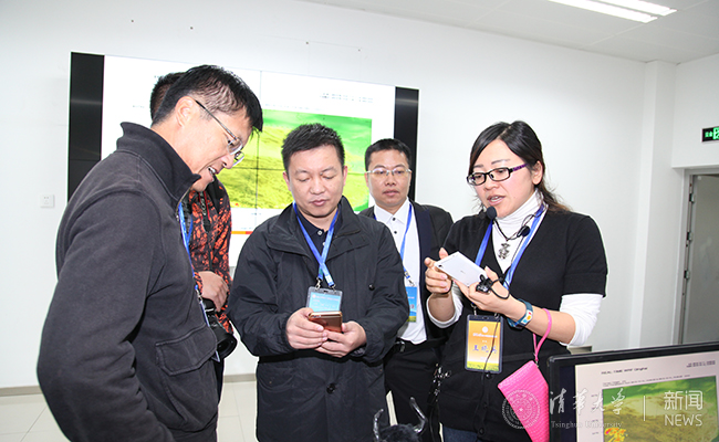 王晓英(右1)向来计算机系参观的清华校友介绍自己的科研项目。