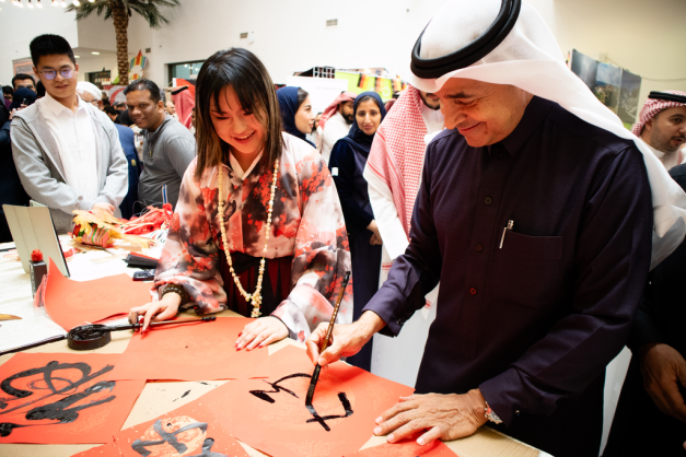 清华新闻网2月7日电 1月29日,“清探沙特”支队在沙特阿拉伯苏尔坦亲王大学开展庆祝春节文化活动。活动开始前,支队同学们与苏尔坦亲王大学孔子学院的老师们精心布置了摊位,红色的灯笼,喜庆的春联,“龙”字背景板营造了浓厚的春节氛围。同学们通过写福字、舞龙、毛笔字教学、二胡、快板表演等形式与当地师生共庆中国春节、展示中国传统文化,活动吸引超过500人参与。