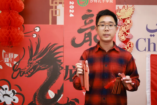 在介绍中国茶道的环节中,支队成员为当地师生带来了“七步点茶”的展示,并用流利的英语做了相关介绍,让参与者们对中国茶文化有了更深入的了解。美术学院2022级本科生孙子涵、为先书院2022级本科生郝英奇为本次活动创作了春联“龙圆丝路梦,福满地球村”,不仅传递了新年的祝福,也体现了中沙两国青年对于人类命运共同体愿景的共鸣。支队同学还教授当地同学们用毛笔写下他们的名字,留作纪念。