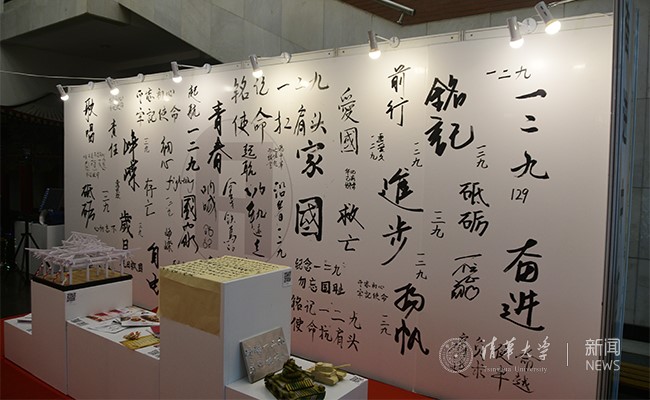 同学们在五四运动展位前书写爱国标语。