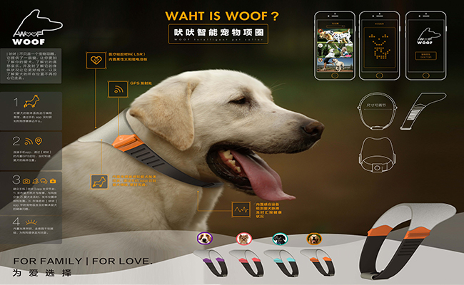 李婧雯设计的“智能宠物项圈”是专门为爱狗人士设计的一款能和宠物狗更好交流的产品。基于对宠物的肢体动作进行归纳整理编程,通过产品本身内置的传感器感知宠物的肢体语言,同时建立手机[吠吠]app社交平台,及时获知宠物狗想要表达的情绪,更好的理解宠物的心情并与之沟通。在[吠吠]app上与爱犬人士建立朋友圈,发布爱犬的照片与故事,与网友分享。产品内置的感应设备可以检测到爱犬脉搏及卫生状况及时向主人汇报健康状况,同时可以在线咨询app中的宠物医生及时解决爱犬的健康问题。产品内置GPS定位系统,连接手机app可及时获知爱犬的具体位置,分享位置求助狗友圈,大大降低了走失的风险。运用医疗硅胶材料(LSR)内置柔性太阳能电池板可为智能宠物项圈提供持久动力,还可以为项圈内的内置光束照明功能提供动力,和爱犬在夜间散步时不再担心前方黑暗。漂亮的光束效果也为宠物和主人在夜晚增加了魅力。