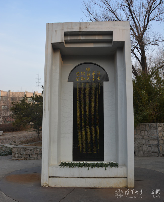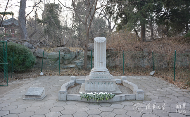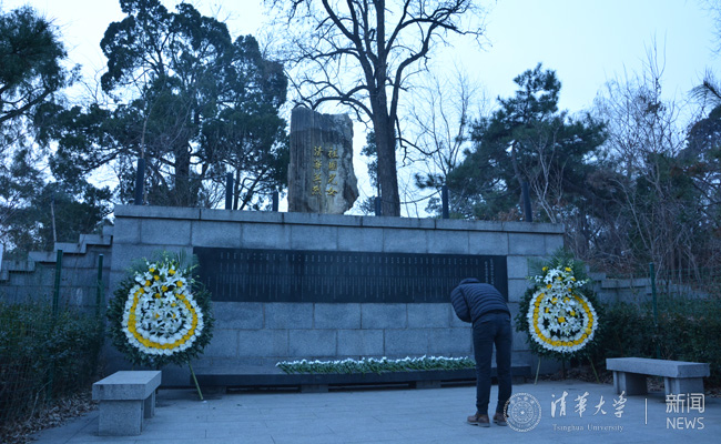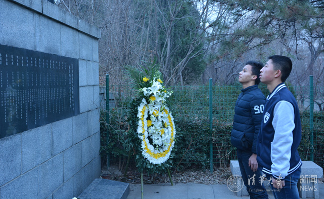 清华学生在纪念碑前祭扫。