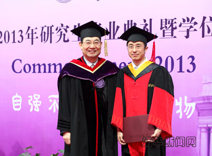 图为陈吉宁为毕业研究生颁发学位证书。石加东