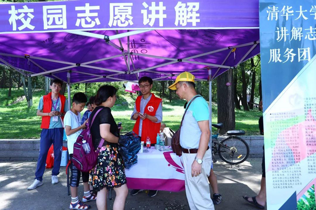身穿红马甲的志愿者在西湖游泳馆路口和日晷前固定站点为游客提供咨询,在日晷、清华学堂、同方部、大礼堂、科学馆、水木清华、图书馆7处为游客讲解清华风貌,同时志愿者也可根据需求带领访客参观讲解校园。