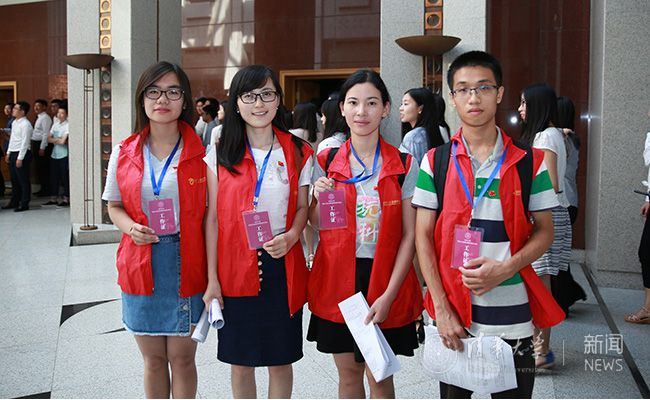 研究生毕业合影现场的党员志愿者。记者 苑洁