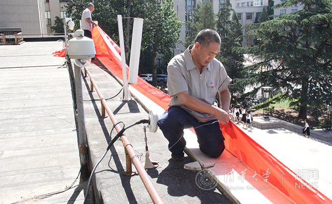 接待中心保障科党员在主楼挂横幅。