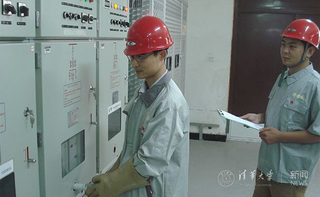 修缮中心党员胡玉森、侯建华巡视检修配电室。