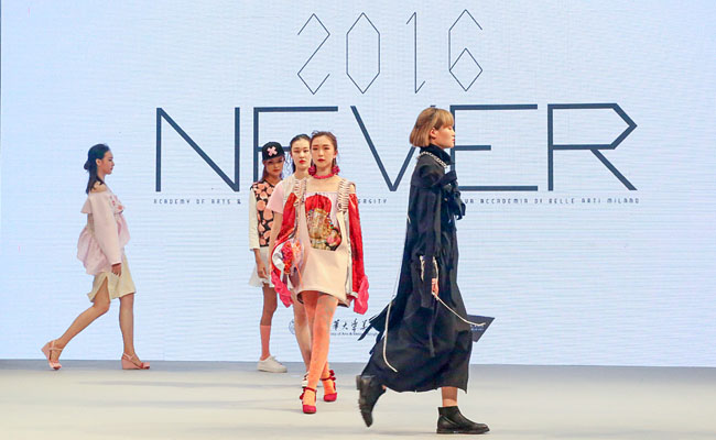 本次发布会的主题为“NEVER”。一个“不”字代表着设计师们的执着,和他们心底里充满激情的、无休止的呐喊。对于这些设计师来说,“不吐不快、不作不休”正是设计的灵魂。发布会上两校23位毕业生联合发布了共八十四套服装设计作品。作品展现了两校服装专业毕业生对当代社会的关注和探讨、对传统文化与后现代多元文化发展的思辩与表达,以及中、西方文化的碰撞与融合。