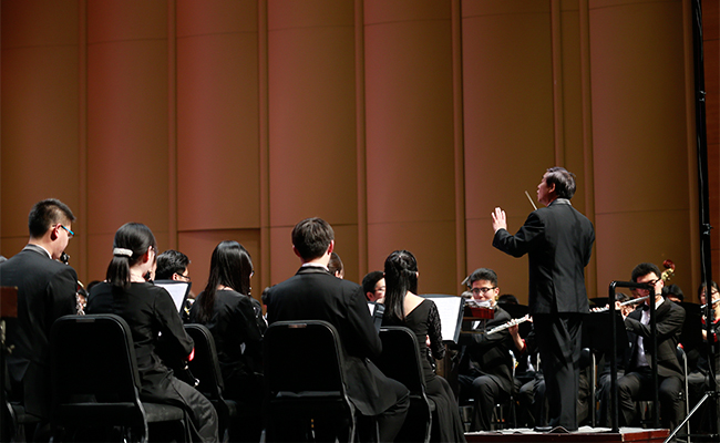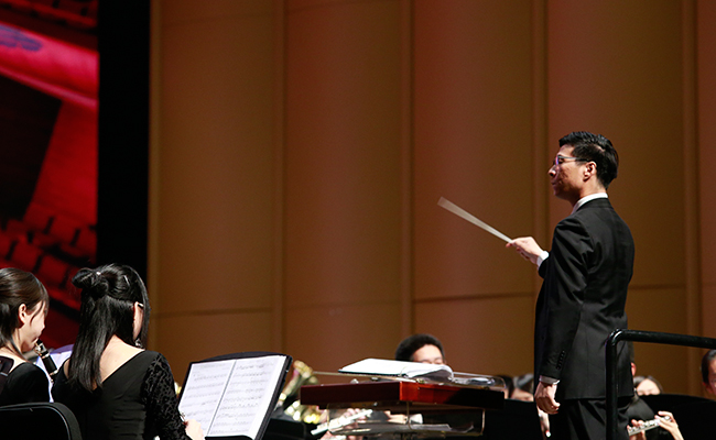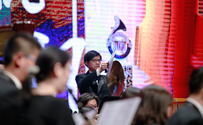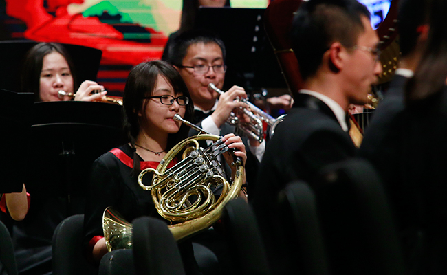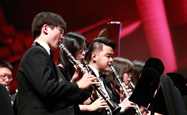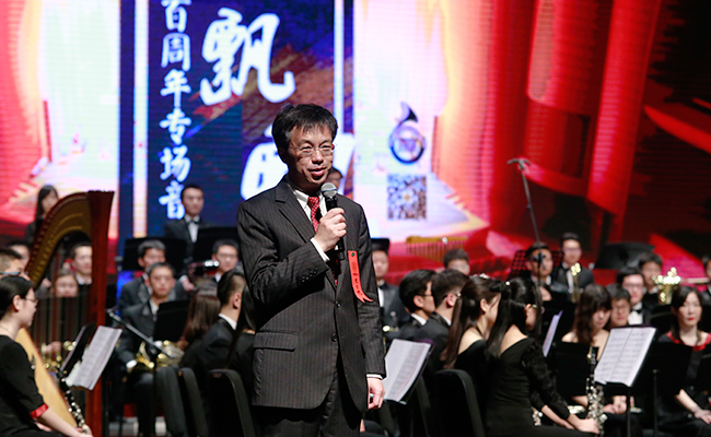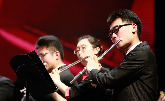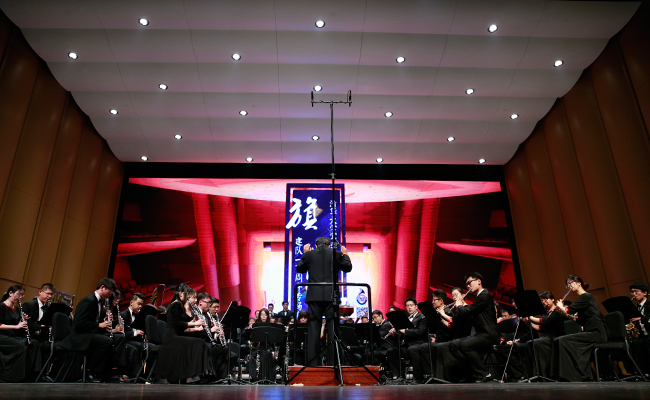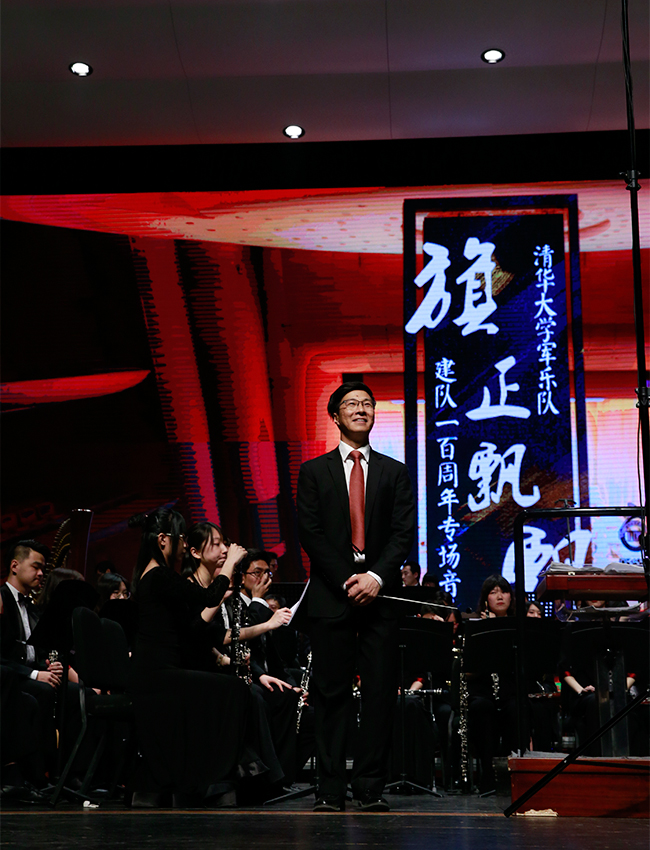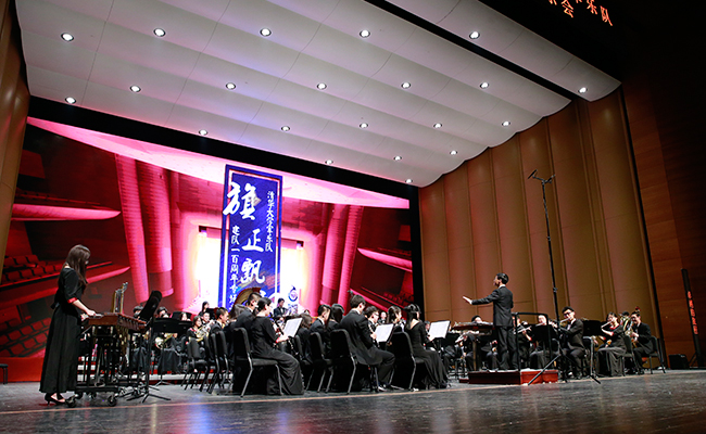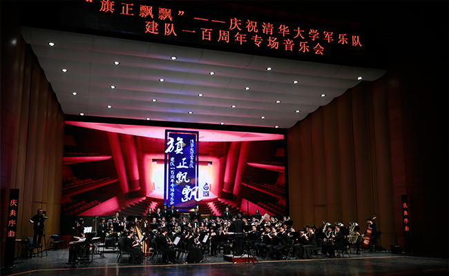 清华新闻网4月28日电 (记者 张 宇 摄)4月24日,“旗正飘飘”——纪念学生艺术团军乐队百周年专场音乐会在新清华学堂举行。近千名军乐队队友与现场1000多名观众共同见证了这一历史性的时刻。